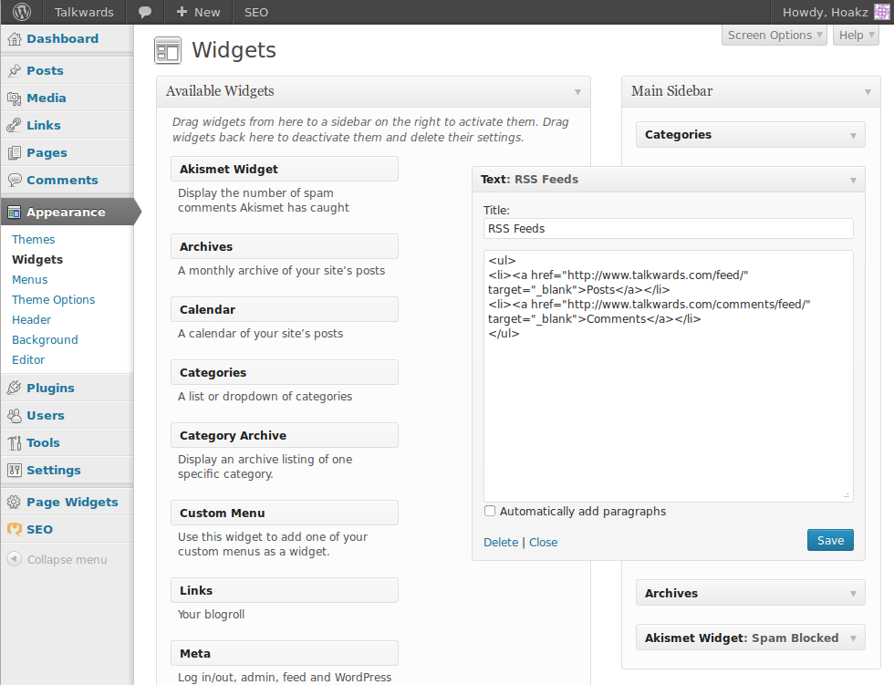 Adding a WordPress Text Widget (click on the image to get a full size version)